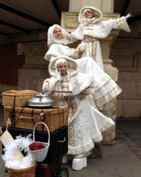 Spectacle de rue en déambulation, interactif avec bande son. Trois comédiennes danseuses, emmitouflées dans leurs manteaux de neige, d’or et d’argent, parsemés de lucioles (leds lumineux), comptines et petits artifices de proximité (paillettes, neige et confettis) agrémentent leur déambulation.