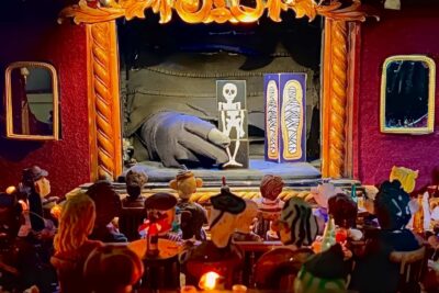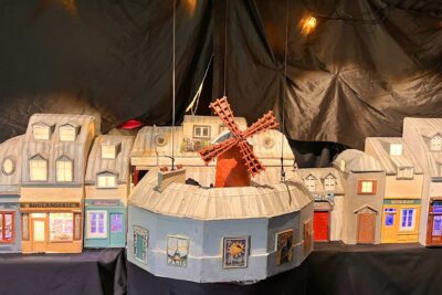 30 personnages sont déjà bien installés dans la salle, les projecteurs et les lampes de tables sont allumés, le champagne est servi, les rideaux vont s’ouvrir pour laisser place au spectacle. Numéros surprenants avec marionnettes et magie, ombres comiques et chorale origamique en lumière noire. Et pour le rappel, une surprise !
