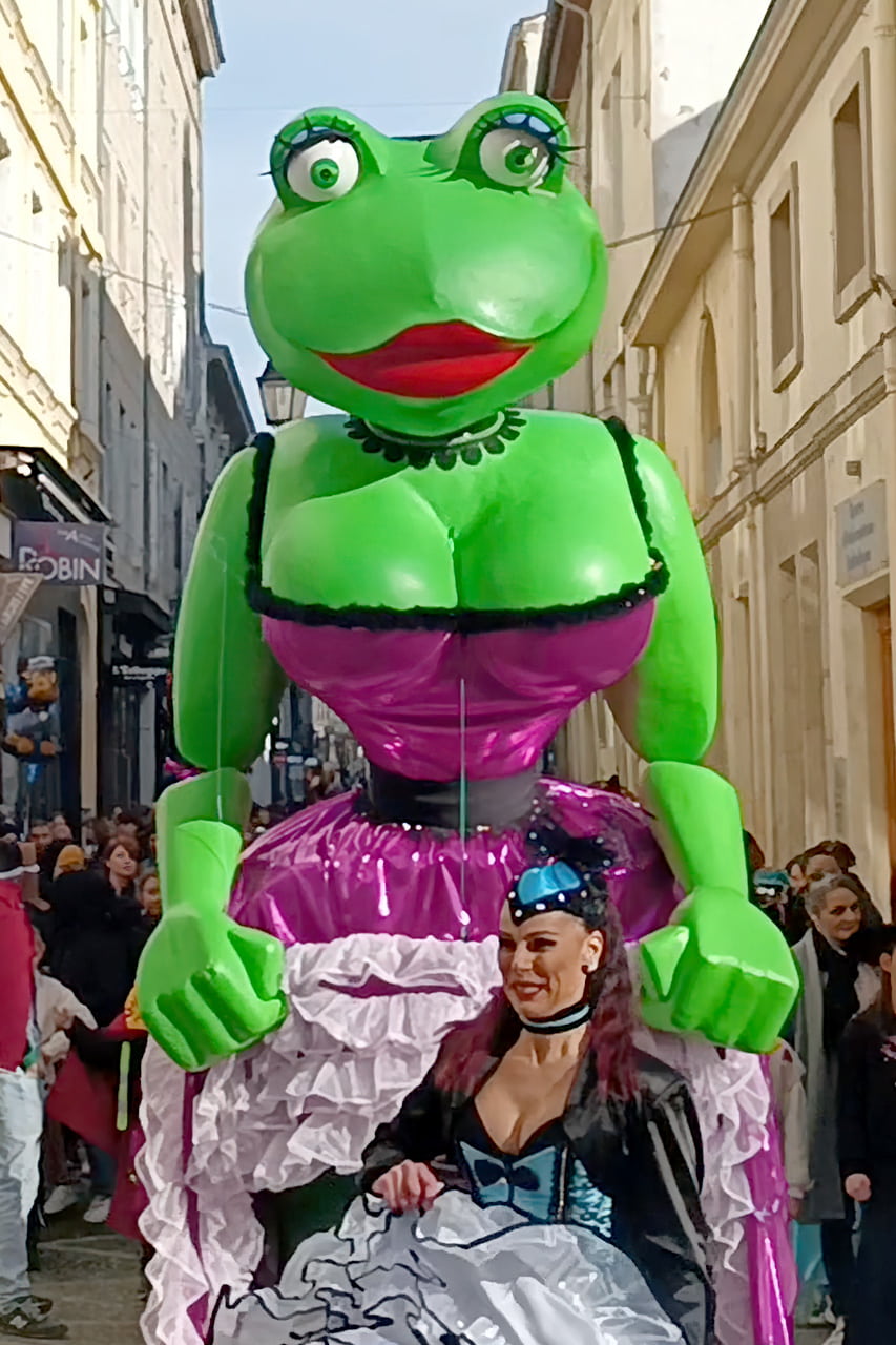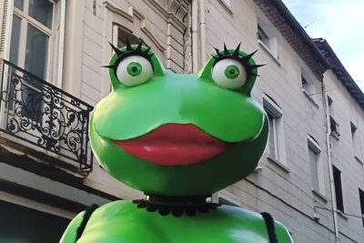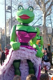 Pour animer une manifestation de façon originale, je vous propose une déambulation de trois grenouilles géantes qui dansent le French Cancan. Trois danseuses tout droit sorties d'un cabaret Parisien les accompagnent, exhortant la foule à leur emboîter le pas au rythme endiablé du galop infernal d'Offenbach.